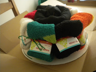 If you are looking for a very, very last minute gift idea, how about making a sock cake? This is very similar to those cute diaper cakes that everyone makes for baby showers, but utilizes something that everyone seems to need, especially during the winter! My wonderful friend Jenn told me about this awesome gift that she’s made before, and I just had to run with it. Hubby’s grandmothers is ALWAYS cold and in need of warm clothing and socks, so this was the perfect gift to put together for her. Let’s go through the steps I did so you can see how I got to the lovely “cake” up there: