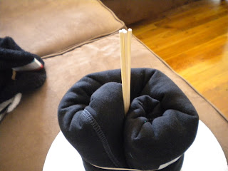 1. Decide on a center. The easiest thing would be something hard and round, like the person’s favorite can of coffee, a big candle, or a nice round bottle of foot lotion. I decided to use one of the Old Navy sweatshirts I got at a great price last weekend. I rolled it from one end and from the other end, and had the rolls meet in the middle. As you can see, it kind of looks like a heart. I placed a rubber band around the sweatshirt and then a few skewers down the middle to keep it steady on the cake board.