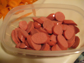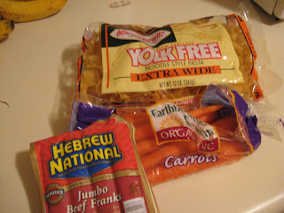 Cast of characters: One pack Jumbo franks, carrots (organic is extra yummy), package of egg noodles, and a tablespoon of butter (not pictured).