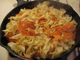 Once you are done with the hop-dogs, throw the carrots into the skillet and toss them a bit. You gotta get that hop-dog, butter flavor on them. Then toss in the noodles and turn the heat down to medium. Toss once again. Add a few shakes of salt and a few shakes of pepper.