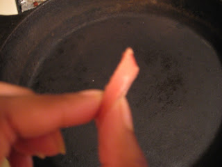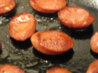 Like that. There. You happy? Now turn on the heat to medium high under your handy dandy cast iron skillet, drop in that butter and place one layer of the sliced hop-dogs in that hot bad boy. No iron skillet? Just use any 9 or 10 inch skillet you have.