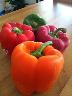 Even the grocery stores are getting in on the spring celebration! My ShopRite had oodles of peppers put on clearance. I got these 4 giant peppers for 1.50.