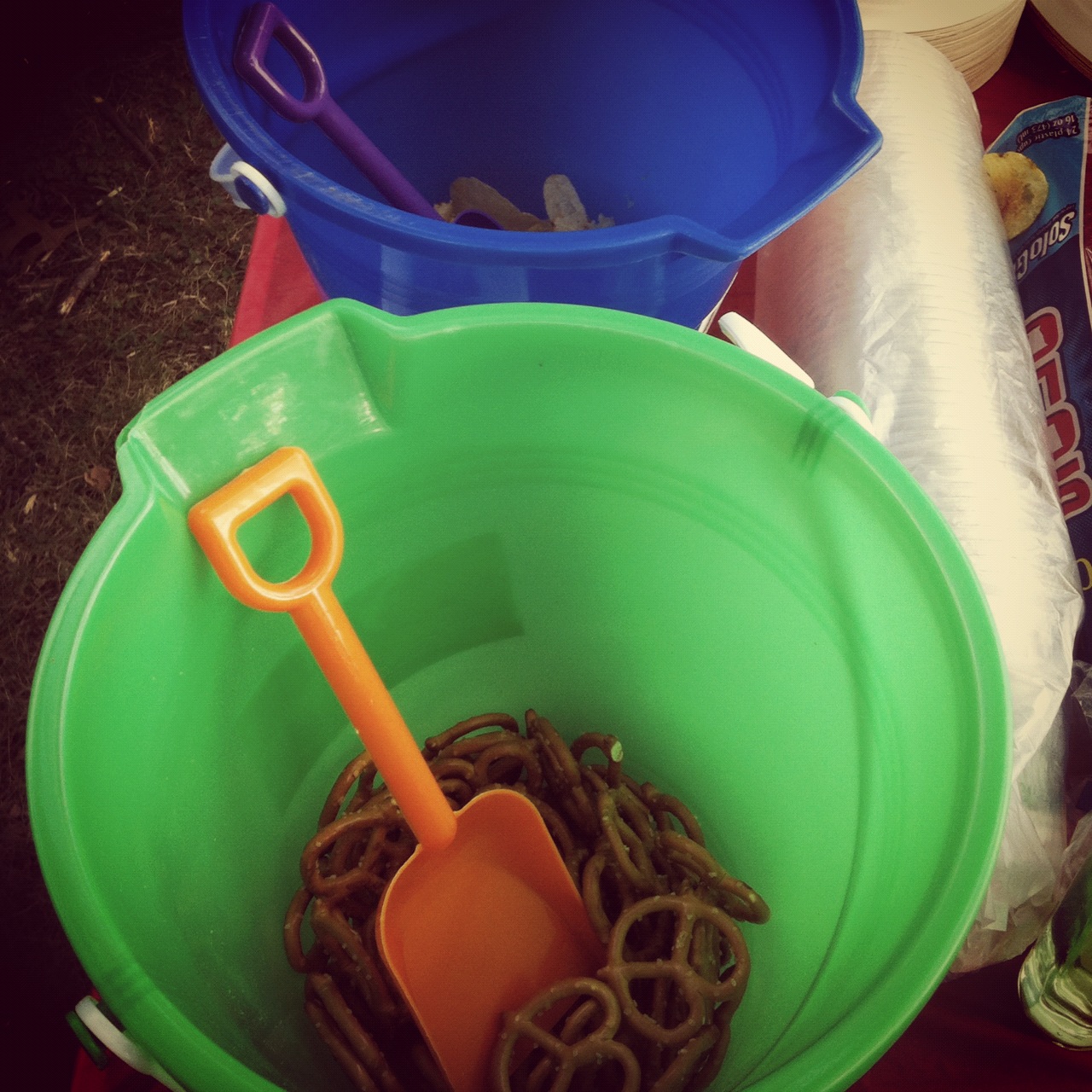 Bowls for the pretzels, potato chips and tortilla chips! This was a genius idea that popped into my mind while at the store. I was looking for big bowls and saw these large buckets just sitting in the toy aisle. The shovels made a great scoop as well, and everyone appreciated that they didn’t have to use their hands or tongs to grab their snacks. I also bought some shower caps and we used those to cover the snacks so the bugs wouldn’t get at them. Awesome sauce.