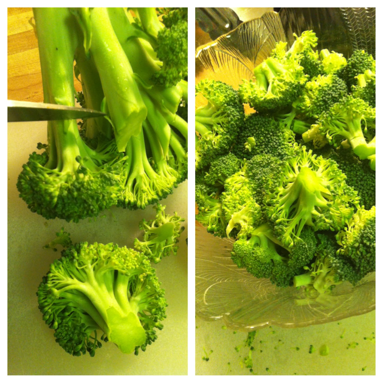 I cut the florets off the broccoli and placed them in a large microwaveable bowl, along with some water. I save the stems and slice them thin to use in stir fry for another meal.